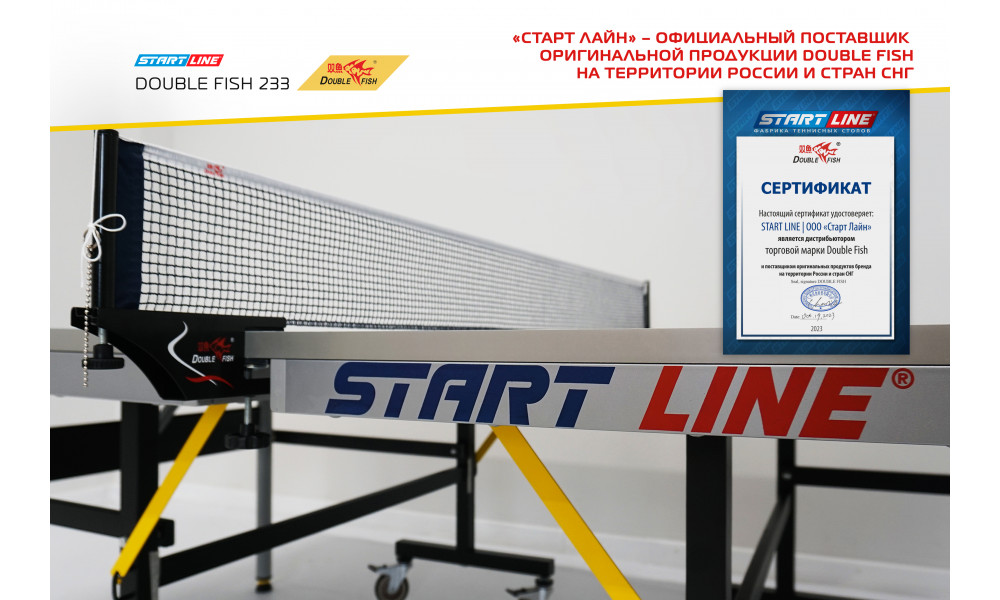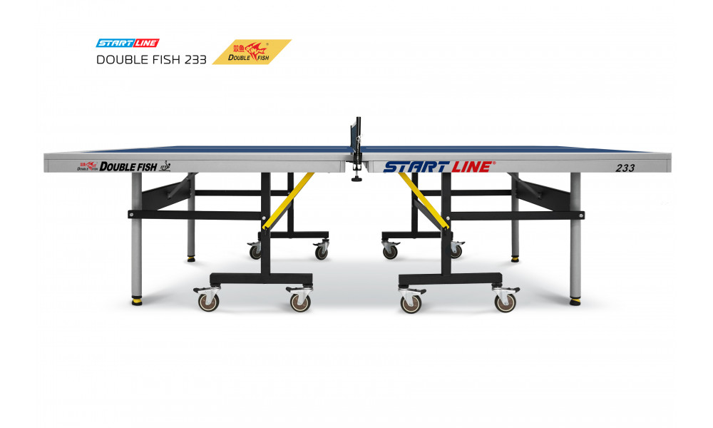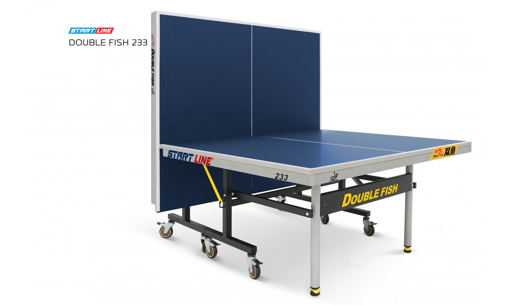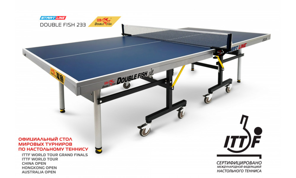 Теннисный стол Double Fish 233 представлен эксклюзивно Start Line на территории России и стран СНГ. Double Fish 233 - уникальная для теннисного мира интеграция двух брендов Start Line и Double Fish. Start Line — ведущий российский производитель, зарекомендовавший себя на профессиональной спортивной арене настольного тенниса. Double Fish – бренд с мировым именем, который специализируется на производстве высококачественных профессиональных товаров для игры в настольный теннис. Сочетание инновационных конструкторских подходов Start Line и новых принципов построения оборудования Double Fish позволило сегодня представить уникальную модель теннисного стола Double Fish 233. Высочайшие игровые характеристики и передовые решения ставят модель Double Fish 233 на почетное место среди профессионального теннисного оборудования. Профессиональный теннисный стол Double Fish 233 сертифицирован Международной федерацией настольного тенниса #40;ITTF#41;. Размеры стола в рабочем положении 274 х 152,5 х 76 см. Уникальной особенностью новой модели является десятислойная УФ покраскаnbsp;nbsp;столешницы из МДФ толщиной 25 мм.nbsp;nbsp;Большое количество слоев повышает уровень износостойкости стола, а также обеспечивает равномерныйnbsp;nbsp;отскок мяча до 23,8 см от поверхности столешницы.nbsp;nbsp;Высокопрочная и долговечнаяnbsp;nbsp;покраска надежно защищает стол повреждений, сколов и вмятин во время интенсивных турниров. Модель обладает исключительной устойчивостью и прочностью. Легкая и удобная настройка рабочей позиции теннисного стола обеспечивается при помощи регулировки боковых опор и всех поворотных колес. Основа концепции — надежная фиксация всех точек опоры, позволяющая сохранить столешницу строго в горизонтальной плоскости на любой поверхности. Восемь обрезиненных транспортировочных колес обеспечивают простоту перемещения стола, позволяя быстро и легко передвинуть стол на нужное место. Надежные и прочные колеса оснащены фиксаторами, которые гарантируют жесткую устойчивость стола во время игры. Слияние опыта и новейших технологий позволило создать комфортную и безопасную систему складывания теннисного стола с возможностью фиксации. Такое технологическое решение обеспечивает устойчивость конструкции, снижая риск опрокидывания стола, а также два эксплуатационных преимущества: минимальные габариты изделия в положении хранения и удобство манипуляций при транспортировке. Стильный и лаконичный дизайн теннисного стола является еще одной особенностью новой модели. Double Fish 233nbsp;nbsp;имеет синее покрытие столешницы и контрастную разметку белого цвета. Теннисный стол Double Fish 233 не требует сборки. Модель поставляется в собранном виде, нужно только прикрутить опоры и транспортировочные колеса. В комплекте со столом идет профессиональный набор аксессуаров для настольного тенниса, в него входит две ракетки с сертифицированными накладками...